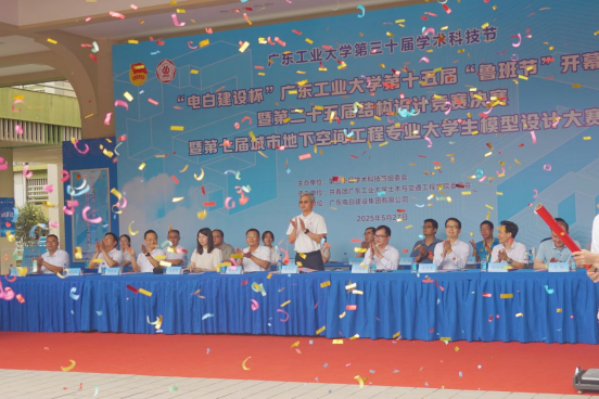 陈卓武宣布开幕。“产教融合再深化,竞赛体系更完善,规模影响创新高。”他肯定了“鲁班节”十五年来在学术科技竞赛上的育人成效,并寄语学生:“在竞赛中打磨专业本领,在实践中厚植家国情怀,未来在绿色建造、数字孪生、机器人建造等新赛道上,以智慧赋能传统行业,成为未来中国建造的中流砥柱。”今年是电白建设冠名赞助“鲁班节”的第二年,99级建筑工程专业校友廖国维对进一步深化校企合作、推动产学研用深度融合充满了信心,他期待发掘更多志同道合的青年才俊,与电白建设共绘发展蓝图。土木工程专业大四学生戴凯瑶作为往届参赛代表发言:“这是我参加‘鲁班节’学术科技竞赛系列活动的第四个年头了,从纸面上的设计图,到用竹皮制作手工模型,这种‘做中学’的经历,远比课本更令人难忘。”