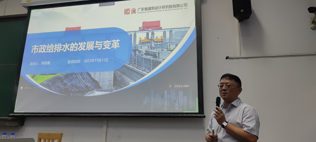 第二场学术讲座广东省建筑设计研究院有限公司副总经理李德强做了题为《市政给排水的发展与展望》的专题讲座。讲座中,李德强副总经理总结了市政给排水的发展历程,结合“高质量发展”和“低碳”等未来城市发展理念,分享了关于未来水务行业发展和市政给排水设计企业发展等思考,并探讨了如何利用自身资源和能力破局、如何借助新形势转型发展,做好专业从业的准备。讲座给学院的同学提供了很好的工程经验总结和职业发展启发