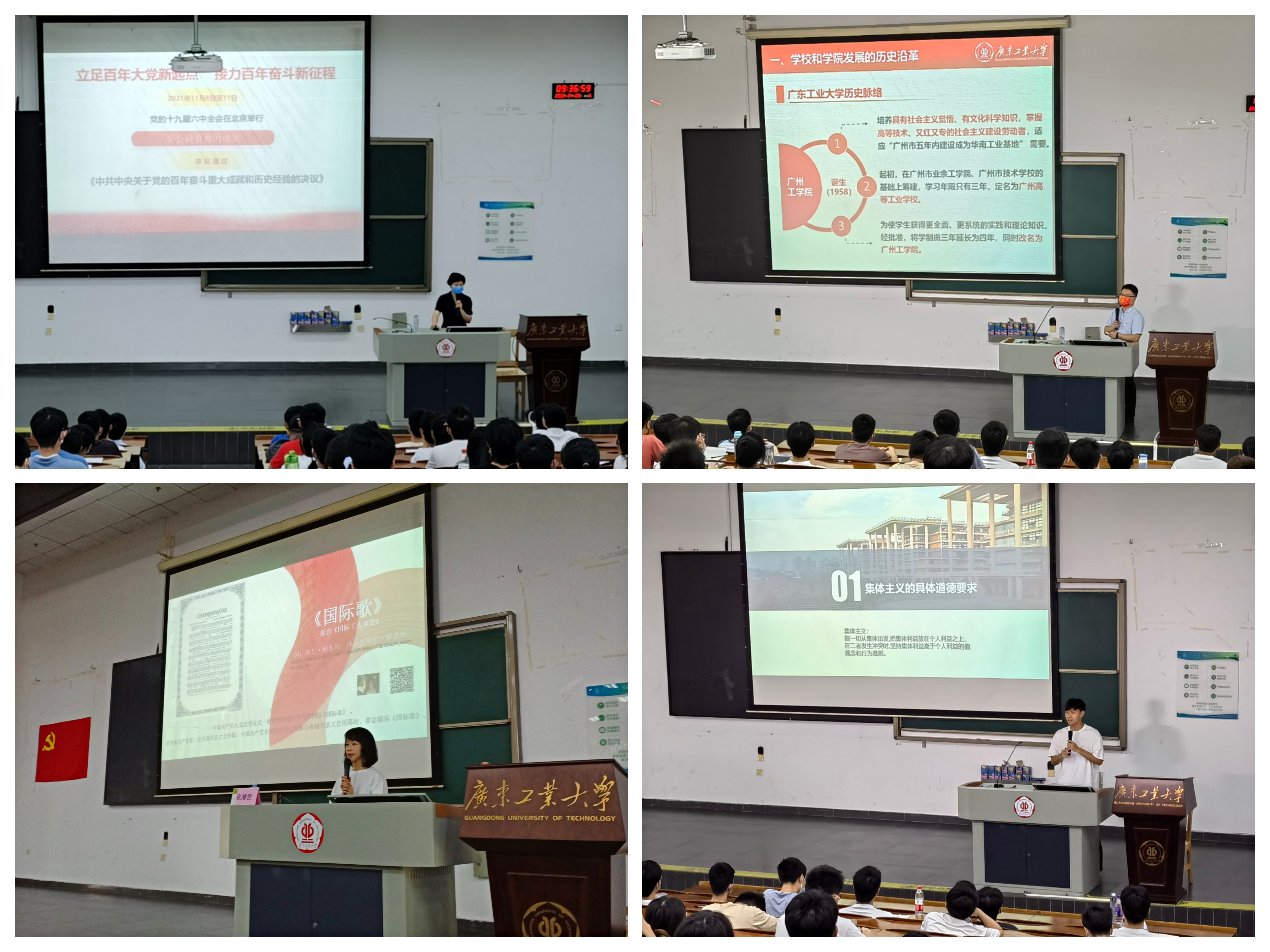 结合院校实际丰富专题课程内容,提升学员学习积极性。4月9日至4月23日,学院分三期开展专题理论培训。学院党委书记邓俊讲授党课《百年奋斗谋复兴,勇毅前行兴伟业》,她以深入学习贯彻十九届六中全会精神为核心,结合丰富的视频资料,从伟大飞跃、伟大时代、历史贡献、行动指南四个部分进行讲授,勉励青年入党积极分子深入了解党的百年奋斗史、深刻认识“两个明确”的重要意义、不断增强文化自信,立足百年大党新起点、接力百年奋斗新征程;学院党委副书记陈颂坚讲授《广东工业大学校史中的红色基因》,分享广工第一任党委书记曾志的革命故事,老院长麦蕴瑜与东深供水工程建设的故事,希望学员们了解广工红色基因,了解学院历史,知校爱校;学校表演专业教师张濬哲以《音乐舞蹈中的红色经典》为题,讲授建党以来的红色音乐舞蹈的创作历程,带领学员了解红色经典音乐舞蹈背后的革命故事;学院党建组织员刘思利给大家讲解入党流程;2018级土木工程学生祝之竞分享其个人学习马克思主义、中国共产党党史的方法和经验。