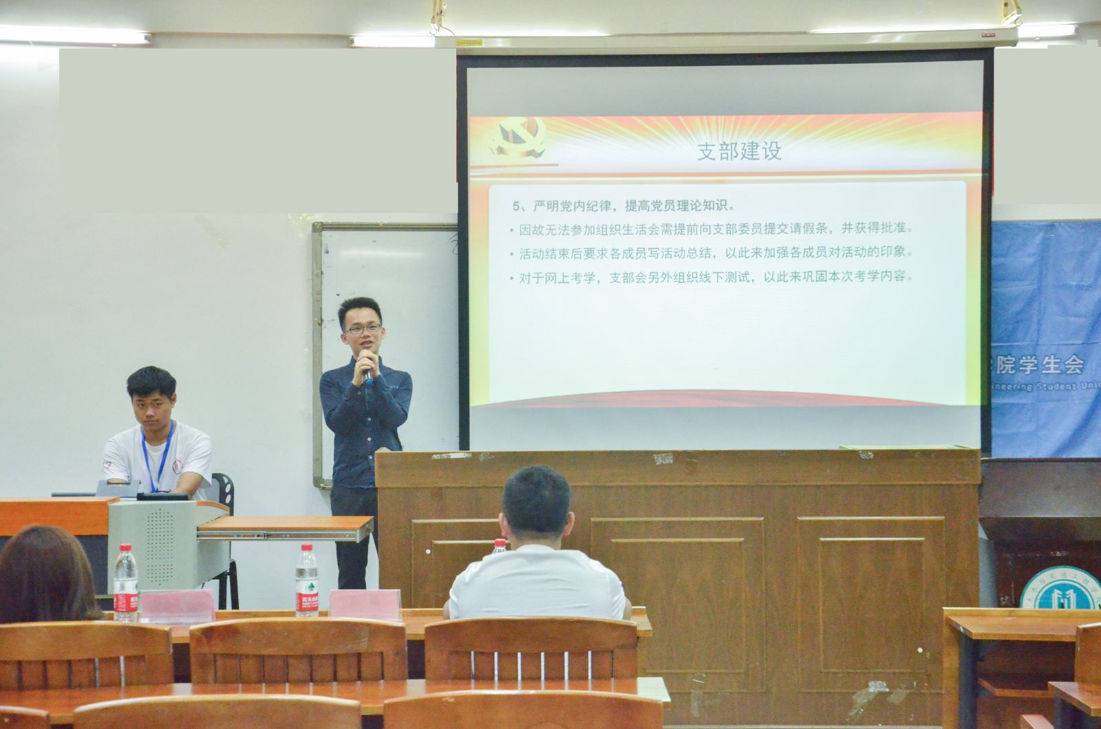 首先进行先进事迹经验分享的是黄紫悠师姐,她用自己大一一年的生活经验告诉同学们发展自己的兴趣的重要性,并告诫大家不要因为顾虑太多而放弃自己喜欢的事情,要勇于争取,不要让自己以后为此后悔。接着,跟同学们进行经验分享的是徐铭振师兄。作为十佳党支部代表,他向大家讲述了自己在学院党支部的生活和党支部对个人学习生活习惯带来的影响,同时讲述了党支部是如何发挥带头积极作用的。廖华权师兄向同学们分享作为班干部如何带领班上同学一起前进的经验。“火车跑得快,全靠车头带”,他认为只有班干部做好带头作用,班级才能建设好,班级凝聚力才得以提升。他倡导要“抱团”学习,要多跟成绩好的同学进行交流。
