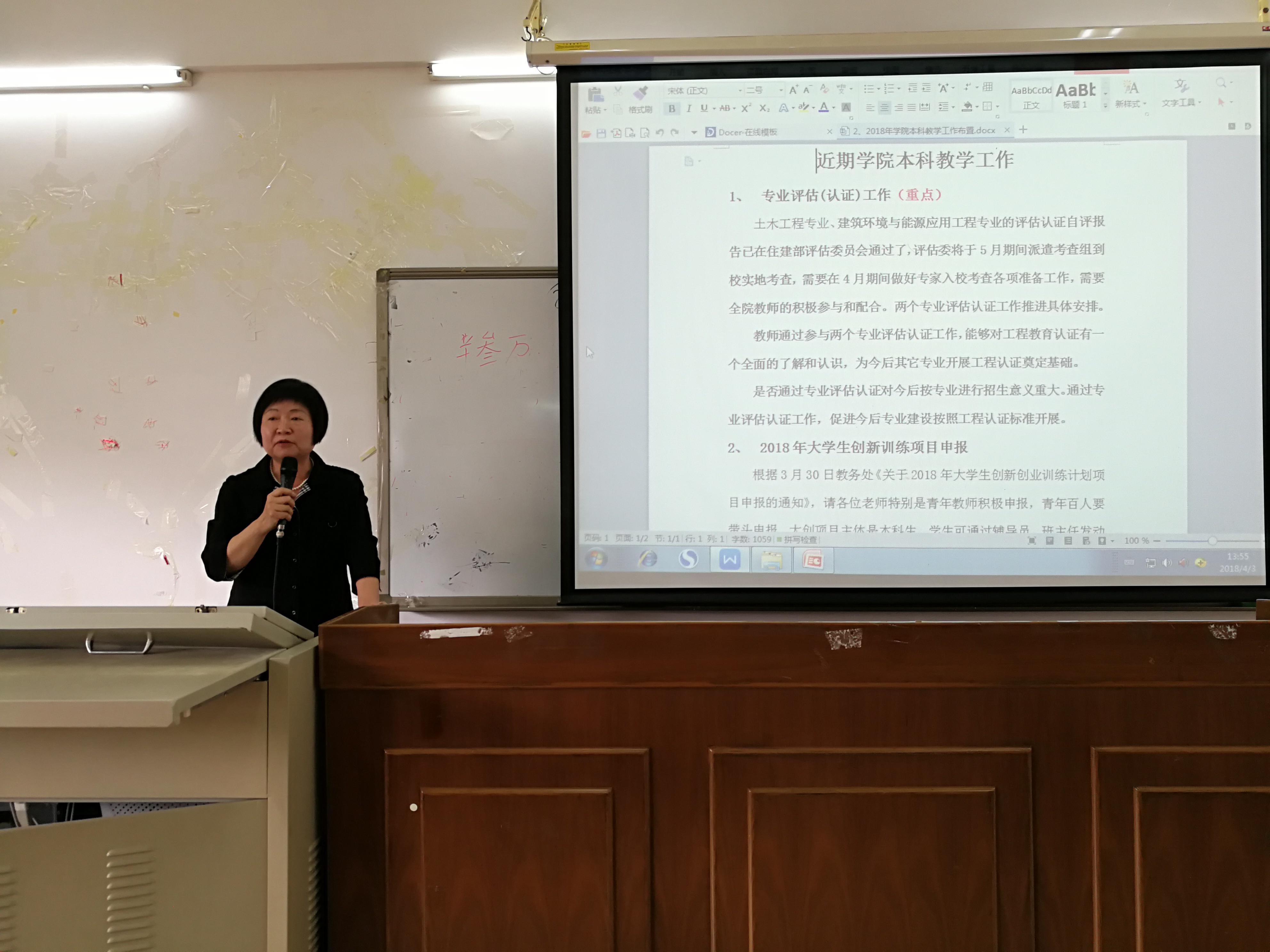 学院院长助理朱江做新学期本科教学工作部署。朱老师对2018年大学生创新训练项目申报、期末试卷归档专项检查、应届毕业生毕业设计指导、开展教学观摩活动安排等常规事项提出工作要求,并要求全体教职工要深度参与、通力合作,重点做好学院土木工程、建筑环境与能源应用工程迎接专业评估(认证)的准备工作,充分认识到该项工作的重要意义,高标准严要求地开展各项工作。此外,朱老师要求各位老师严格遵守学校、学院各项教师课堂纪律,传播正能量,以身作则引导学生正确对待专业学习与校园生活。