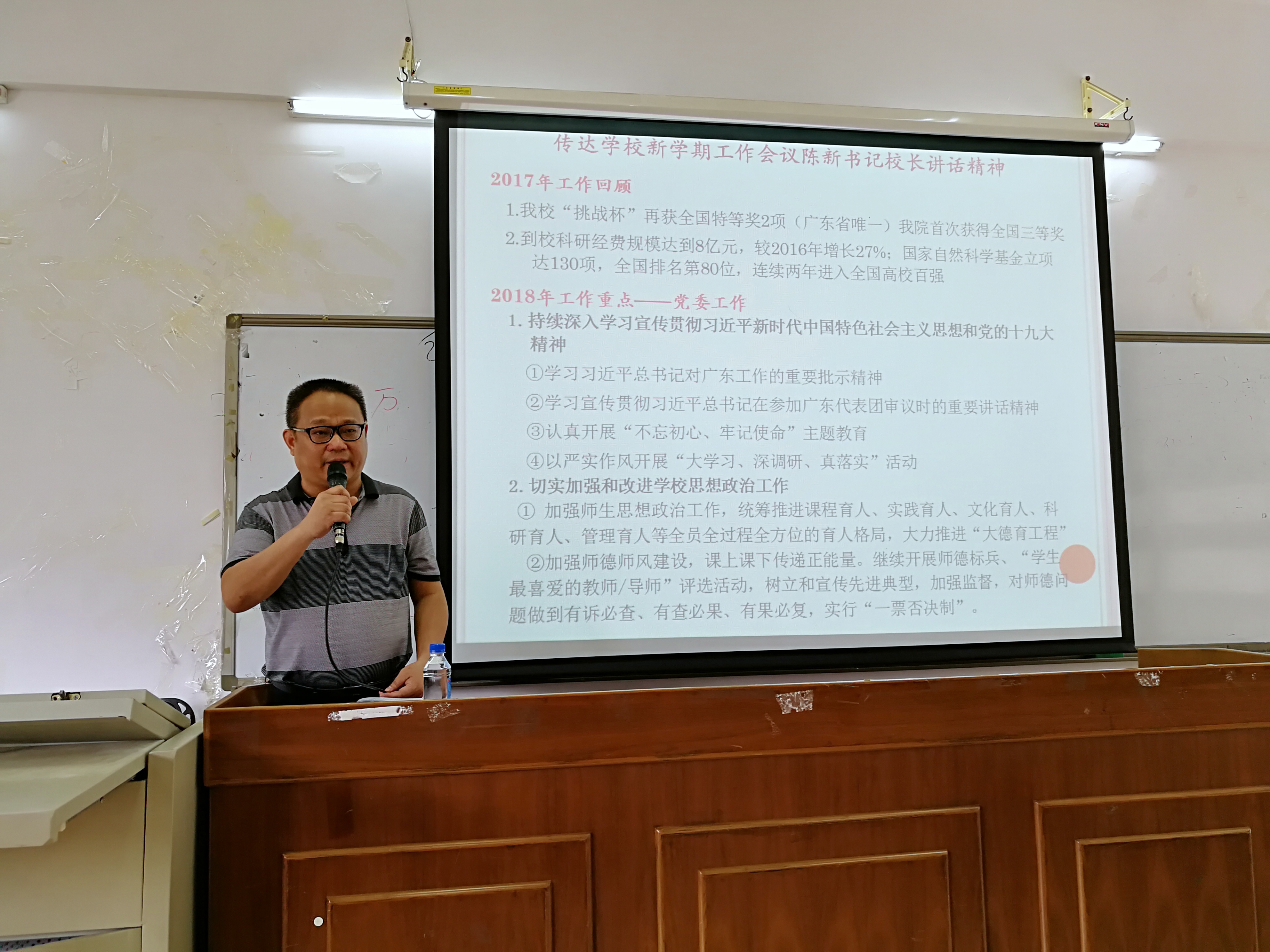 会上,学院院长刘锋传达了学校新学期工作会议精神。刘院长介绍道,2017年是学校取得重大发展的一年,在新的历史时期与发展阶段中,学校党委书记校长陈新同志就党委、行政两方面的工作都做出了新的部署与要求,主要包括:持续深入学习宣传贯彻习近平新时代中国特色社会主义思想和党的十九大精神,切实加强和改进学校思想政治工作,推动全面从严治党向纵深发展,做好学校60周年校庆的组织与宣传工作等;与此同时,要求各学院优化学科结构,提升学科竞争力;坚持立德树人,强化新工科人才培养特色;扎实深耕细作,开创科研创新与社会服务新局;加速人才引育,系统提升师资队伍结构与质量;扩大国际合作交流,深化国际化办学内涵建设;深化改革创新,全面提升管理服务水平。刘院长要求学院教职工要认真学习学校新学期工作会议的重要精神,立足本职岗位做好各项工作,积极投身到学校高水平大学建设事业中。