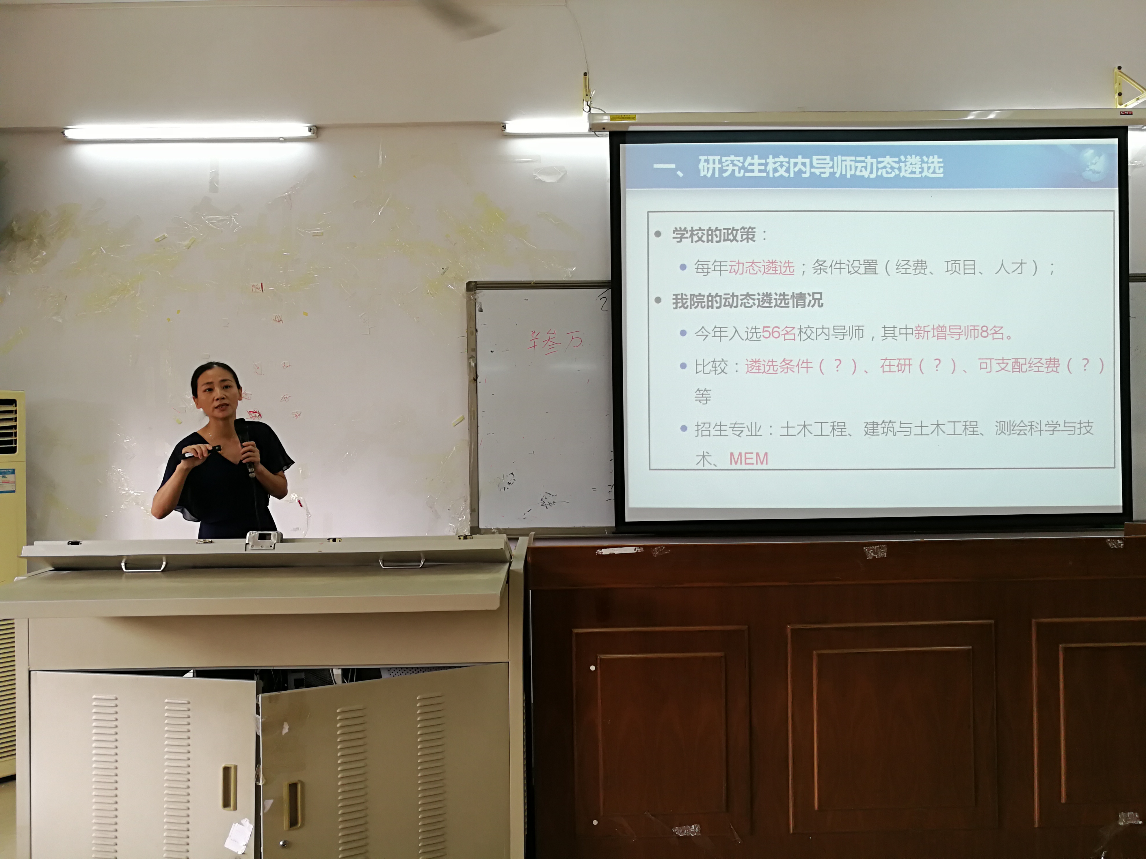 学院副院长王志红做研究生工作部署。王副院长对研究生校内导师遴选、研究生招生录取、研究生毕业论文盲审等工作的有关情况作介绍与说明,她指出,各位老师应认真学习学校有关研究生教育管理等各项政策与规定,按要求做好研究生导师的申报与履职工作,切实指导学生做好毕业论文的准备工作,引导学生明确盲审制度的重要性,高度重视毕业论文的研究工作,要求广大老师应充分认识招生过程中出现的新局面、新问题,加强研究生招生宣传工作,为学校、学院吸纳更多优秀生源,助力学校科研工作。
