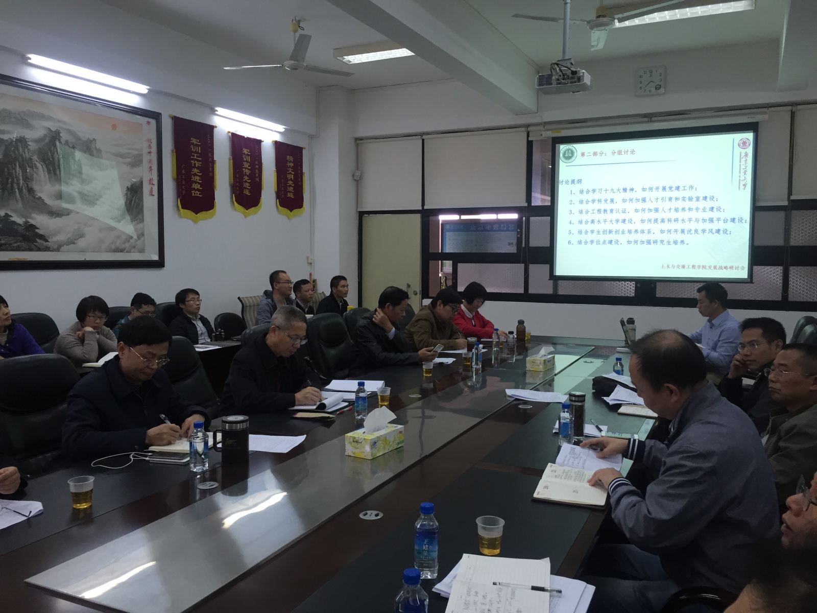 在研讨会第二阶段,与会人员进行了分组讨论,讨论主要围绕结合学习党的十九大精神,如何开展党建工作;结合学科发展,如何加强人才引育和实验室建设;结合工程教育认证,如何加强人才培养与专业建设;结合高水平大学建设,如何提高科研水平与加强平台建设;结合学生创新创业培养体系,如何开展优良学风建设;结合学位点建设,如何加强研究生培养等六个方面展开。分组讨论分别由城市公用设备系主任梅胜、实验中心主任郭永昌、工程力学研究所所长袁兵主持并做讨论情况汇报,建言献计学院未来各项事业的发展。