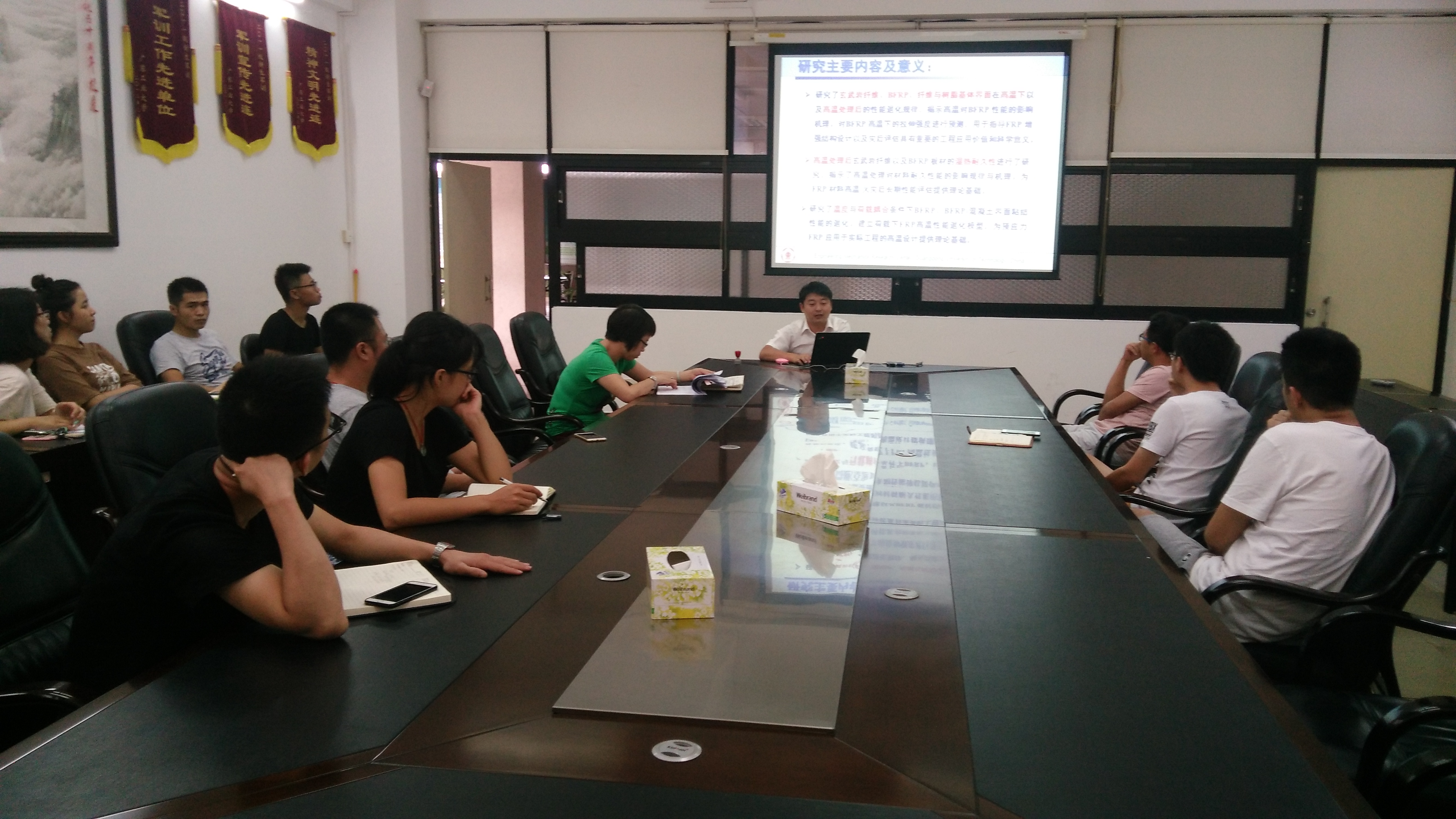 为提升我院学术气氛,促进教师间的科研思想交流,提高我院科研水平,2017年7月4日下午,学院第11期科技交流系列讲座在实验二号楼502会议室举行。本期讲座邀请我院工程力学研究所陆中宇副教授为大家做了“玄武岩纤维增强树脂基复合材料的高温性能研究”的学术报告。学院工程力学研究所部分老师和研究生参与了讲座和讨论。