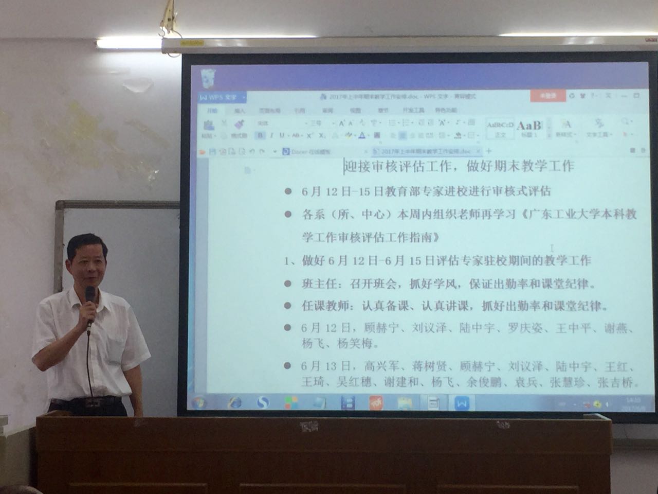 会上,吴炎海副院长对本科教学工作审核评估(以下简称“审核评估”)进行了动员,他强调,全体教师要高度重视本次审核评估工作,要认真学习《广东工业大学本科教学工作审核评估工作指南》;各班主任要召开专题班会,向学生说明审核评估的重要性;各实验室要做好仪器、材料的整理工作。此外,为确保专家访谈等工作的有效开展,在专家进校评估期间,要求全院教职工坐班。吴炎海还对学期末的教学工作进行了安排,着重强调了试卷批改、成绩提交、试卷归档以及监考纪律,要求保证期末教学工作有序有效进行。