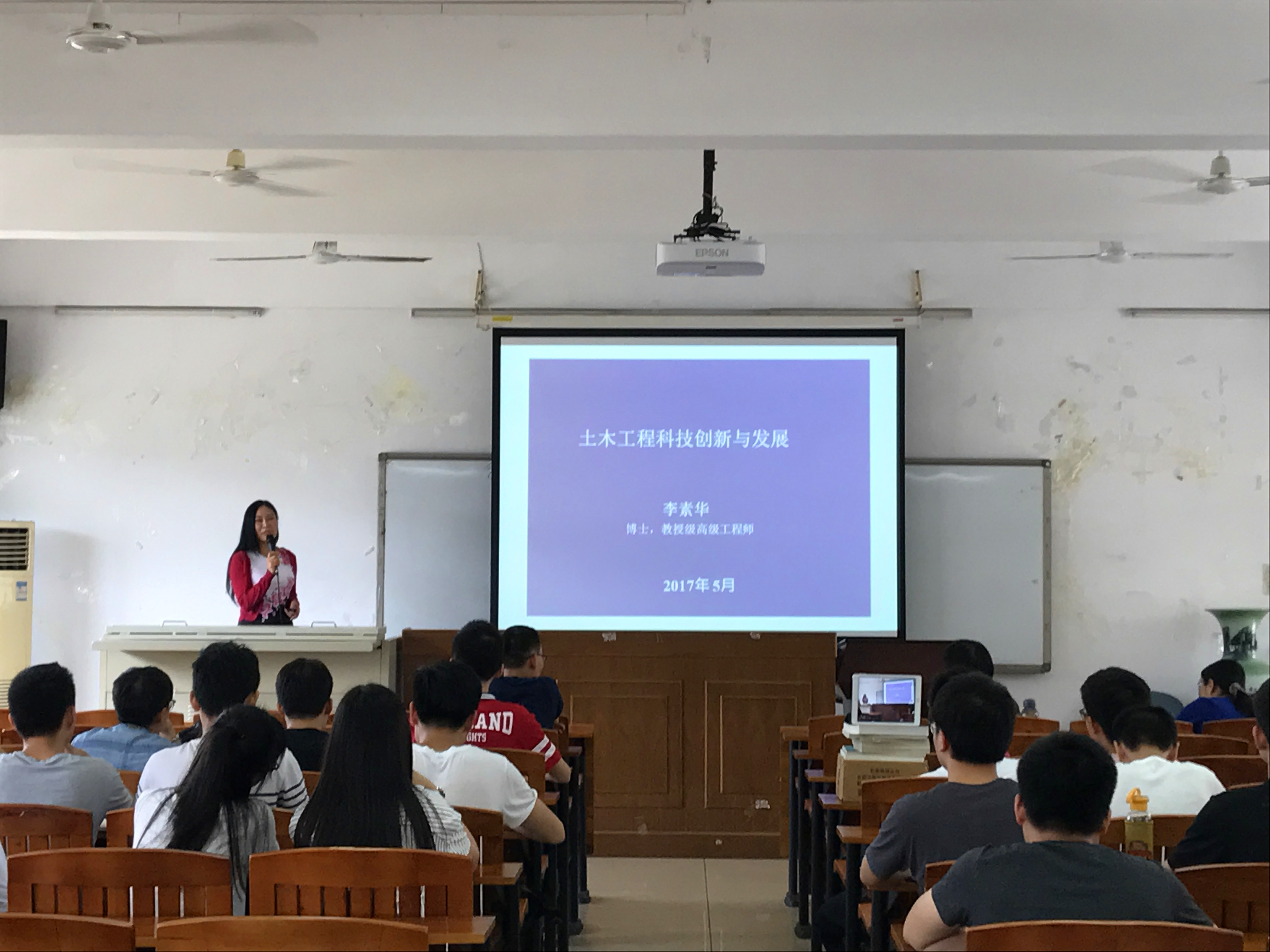 李素华教授级高工首先介绍了工程管理与现场施工的新技术,结合BIM技术的应用和工程基础施工技术的发展历程,充分肯定了土木行业技术创新促进企业转型升级的积极意义,并通过二十多年来建筑业10项新技术的变化,从建筑材料、工程设备、工程信息与智能化等方面介绍了土木工程行业的发展,解读了“技术创新是建筑业转型升级的力量之源”这一观点。随后,她介绍了建筑业发展的最新进展,重点介绍了BIM技术、海绵城市建设、城市地下综合管廊、建筑垃圾再生利用等方面的现状,并展望了其未来的发展。最后,她希望同学们要立足高远,敏锐洞察行业发展需求并为之不断探索,为工程建设的发展贡献力量!