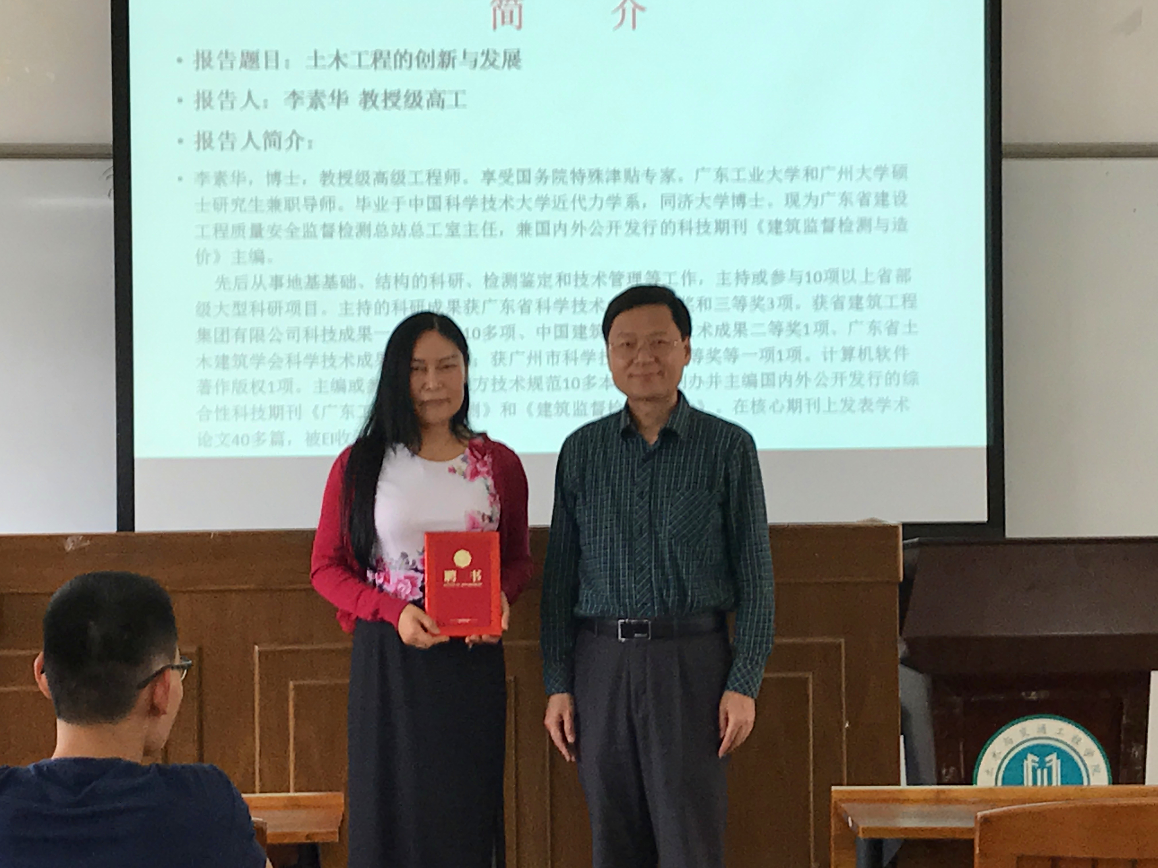 2017年5月23日下午,我院第5期土木论坛----“土木工程的创新与发展”在实验二号楼520举行。本次论坛特邀了享受国务院特殊津贴专家、广东省建设工程质量安全监督检测总站总工室主任、我校硕士研究生校外导师李素华教授级高工作题为“土木工程的创新与发展”的讲座。论坛由248cc永利集团院长助理、土木工程系主任朱江教授主持,永利集团官网书记徐向东出席了本次活动。讲座开始前,徐向东书记代表学校向李素华教授级高工颁发了广东工业大学硕士研究生导师聘书。