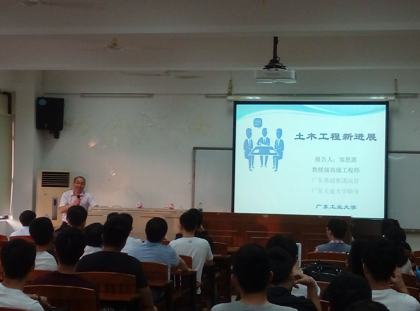 邹思源副总经理根据我国土木行业的发展现状,展望了中国未来土木工程各大领域的发展趋势,重点介绍了土木工程技术方面和工程管理方面的新进展。他通过生动逼真的3D模拟动画和详实丰富的工程现场照片详细介绍了新时期建筑业发展十项新技术,其中由广东省基础工程集团有限公司主要研发并投入工程应用的“非开挖顶管技术”、“大断面矩形地下通道掘进技术”和“复杂盾构法施工技术”引起了在场师生的浓厚兴趣。随后,他介绍了工程管理模式和信息化管理技术的新进展,并结合自身企业管理和项目管理经验,详细解读了“PPP公私合营模式”和“BIM技术5D管理平台”的发展应用理念。最后,他还从一个企业管理者的角度,给在场的同学提出了关于“如何获取知识提高能力”、“如何争取平台融入团队”的宝贵建议。讲座过程中,邹思源副总经理幽默风趣的语言和详实生动的工程案例深深吸引了师生们的注意力,会场不时响起热烈的掌声。