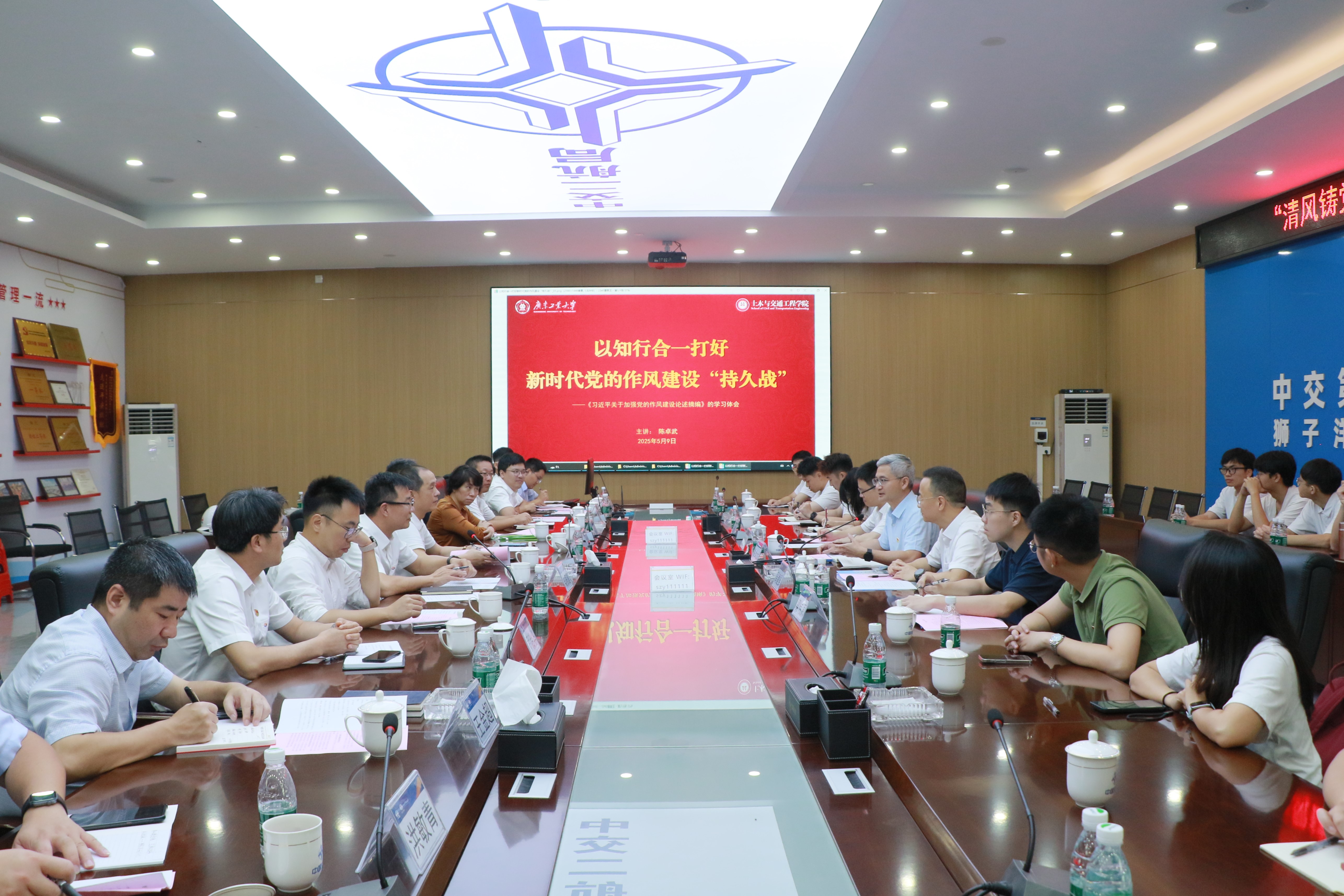 在组织生活交流会上,校企双方围绕党建与业务深度融合展开研讨。陈卓武以《以知行合一打好新时代党的作风建设"持久战"》为题讲授党课,强调党员干部要提升党性修养、坚持问题导向、注重真抓实干。省交通集团直属单位广东省公路建设有限公司党委副书记、工会主席胡坚柱,党群工作部部长张占书、董事会办公室主任顾杰隽,以及广东湾区交通建设投资有限公司相关代表和狮子洋通道项目各标段党支部书记、党员校友代表等企业代表与师生党员就作风建设展开深入交流。会议由广东湾区交通建设投资有限公司党总支书记柴振超主持。
