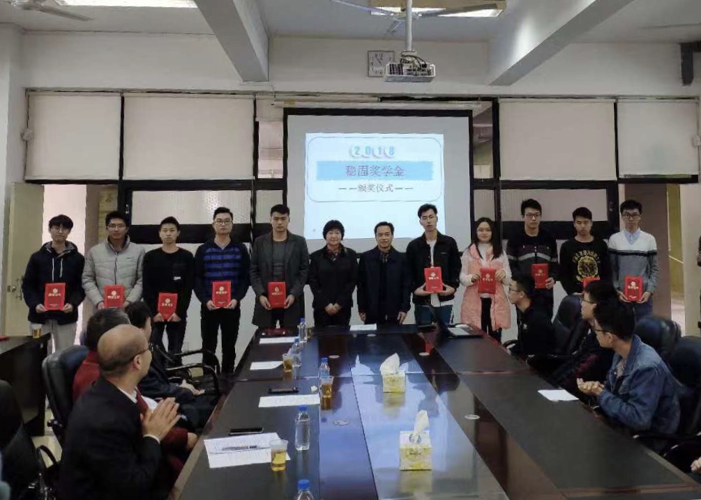 2018年12月28日上午,我院在实验二号楼502举行“稳固奖学金”颁奖仪式。广东稳固检测鉴定有限公司董事长邓锦尚先生、副总经理邝炳添先生、质量负责人刘立创先生、办公室主任何海燕女士,248cc永利集团刘锋院长、党委张育广书记、朱江副院长、全体获奖学生和各年级学生代表出席了本次颁奖仪式。