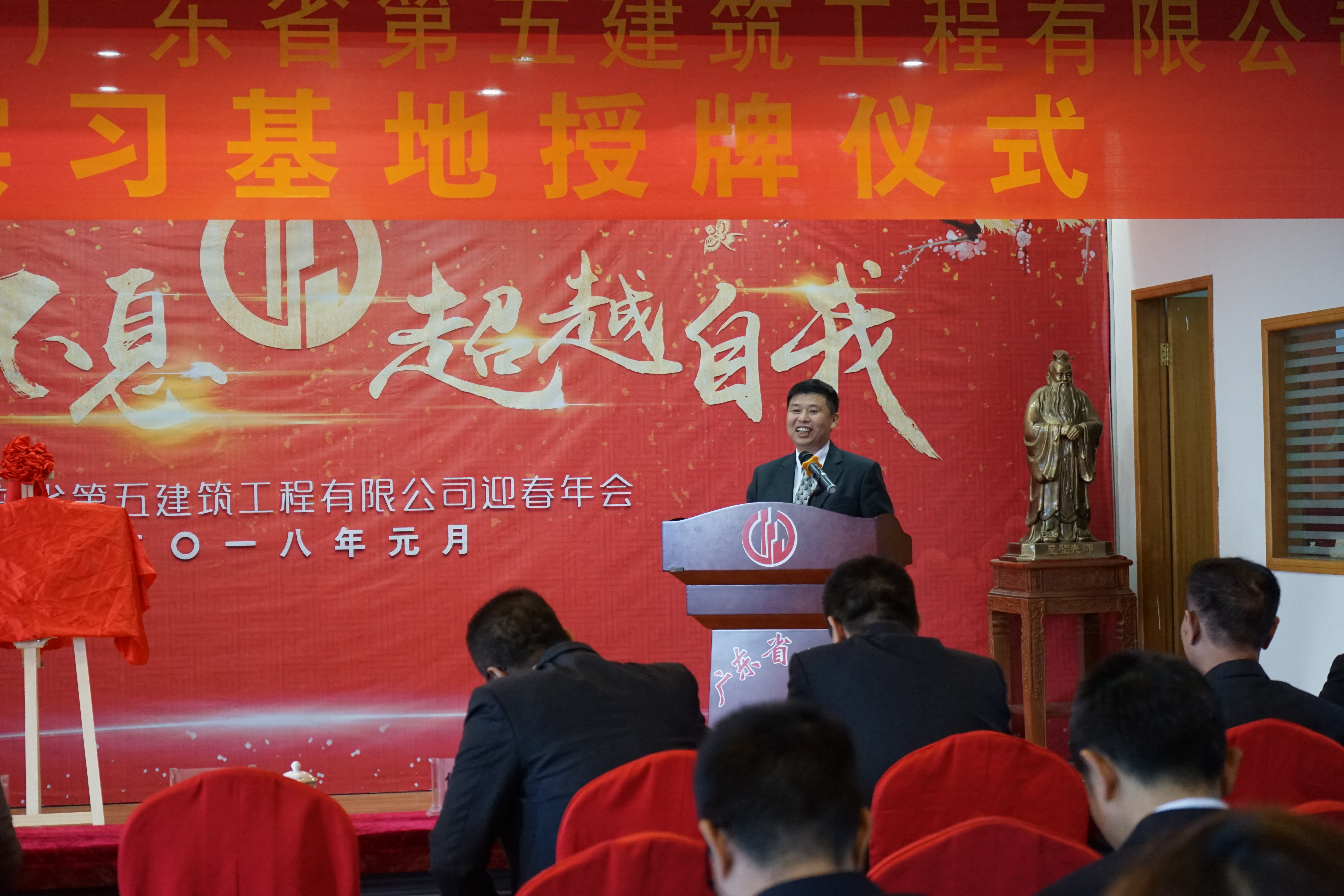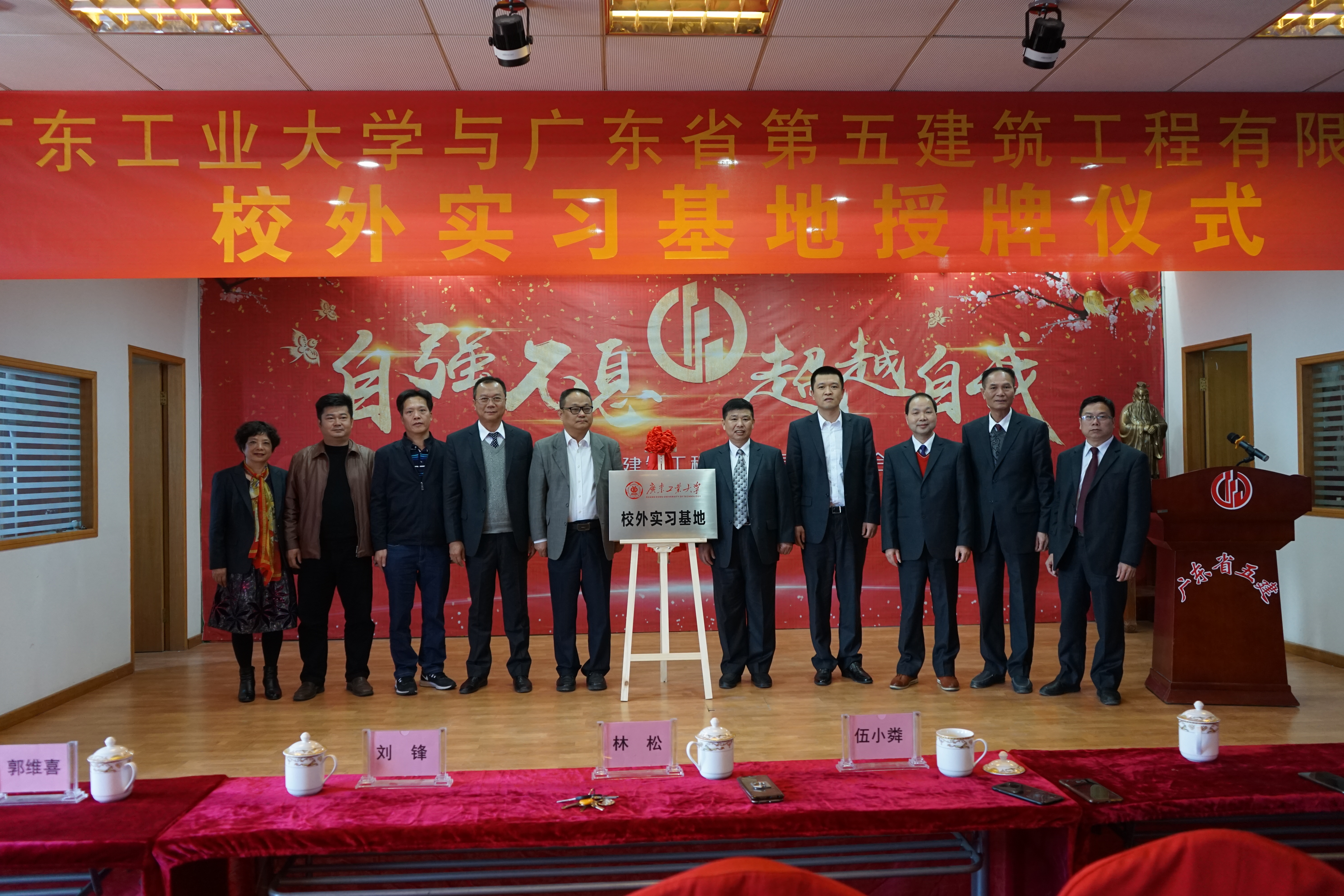 3月22日,广东工业大学与广东省第五建筑工程有限公司(以下简称五建)合作基地挂牌仪式在韶关五建举行,248cc永利集团院长刘锋、党委副书记郭维喜、广东工业大学教务处实践科科长陈鸿志,五建董事长林松、总经理伍小粦以及五建全体员工出席了仪式。