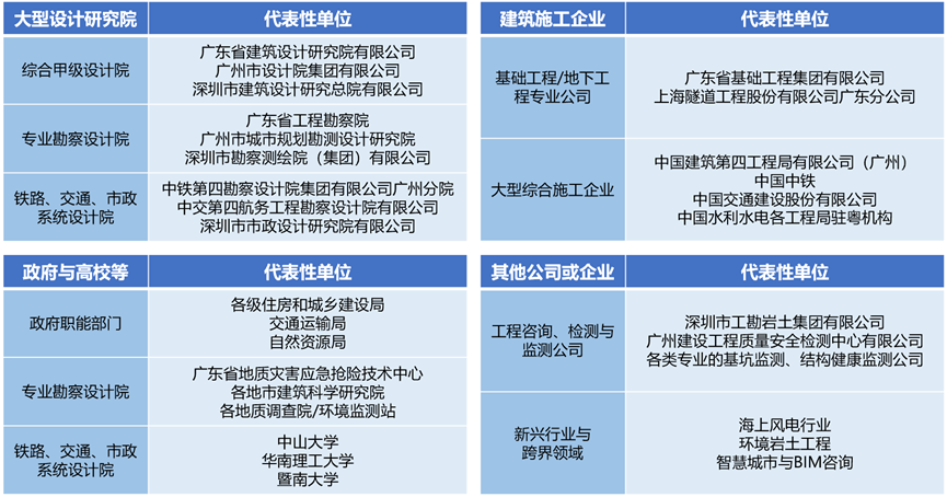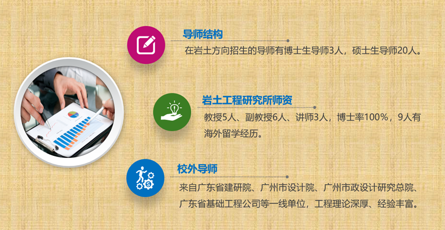 另外在广东省建研院、广州市设计院、广州市政设计研究总院、广东省基础工程公司、东莞市建筑科学研究院、广州盾建建设有限公司等一线科研、设计及施工单位聘有工程理论深厚、经验丰富的校外导师20余名。